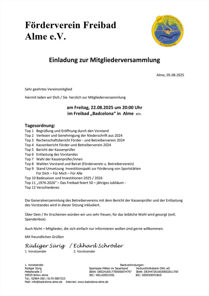hiermit laden wir euch herzlich zur Mitgliederversammlung am Freitag, 22.08.2025 um 20:00 Uhr im Freibad „Badcelona“ in Alme ein.